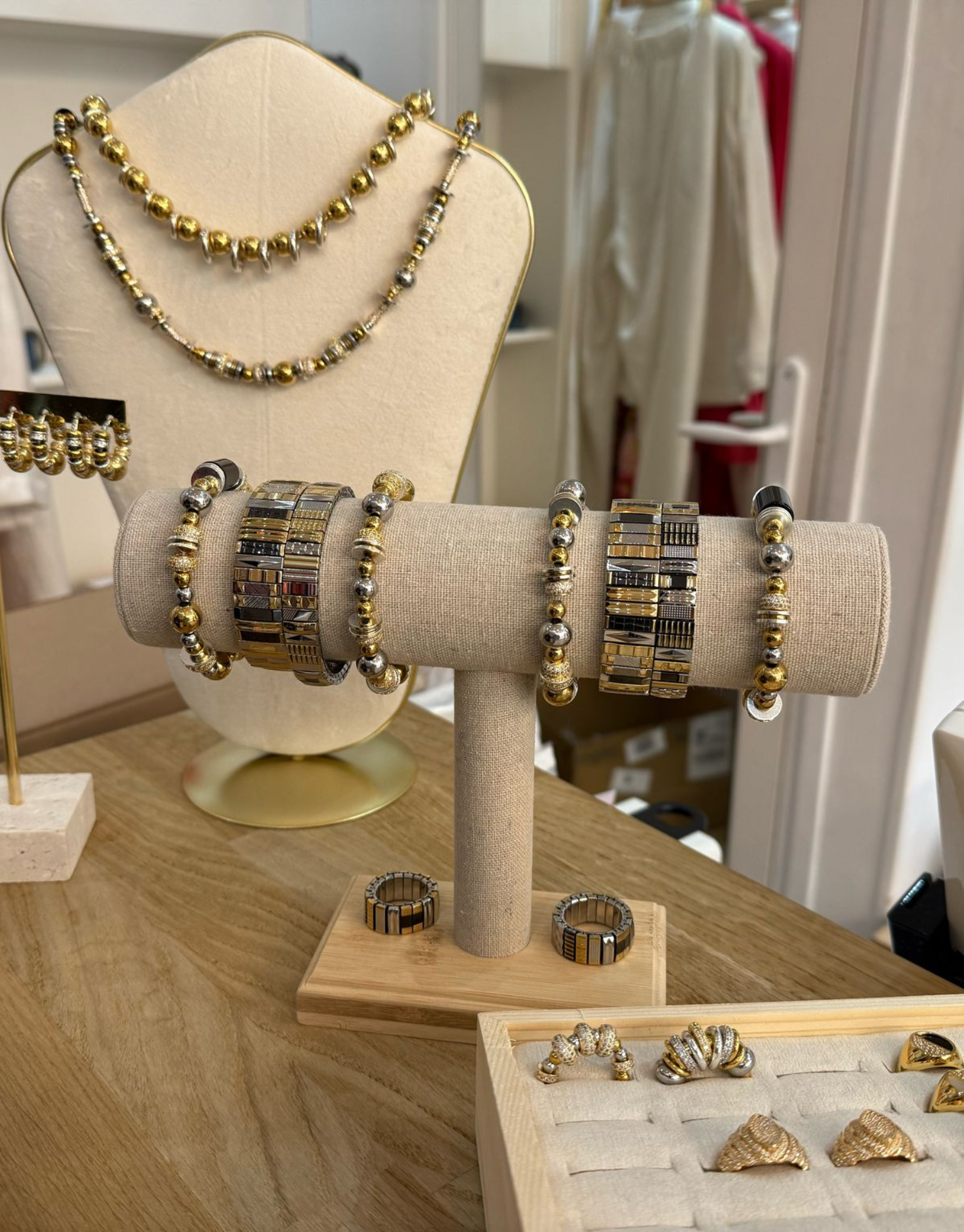 Au centre de leur univers créatif, on découvre le bracelet "SIG", une pièce iconique née de l'assemblage original de maillons de montre, où l'éclat de l'or se marie à la sobriété de l'argent. Ce bijou signature est le point de départ d'une collection harmonieuse et cohérente, pensée pour offrir une esthétique singulière. Décliné en différentes tailles et finitions, le bracelet "SIG" invite au jeu des superpositions et des contrastes, permettant une expression personnelle affirmée.
